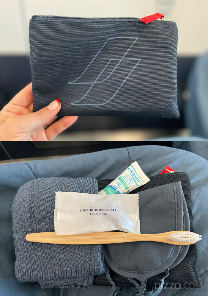 탑승객에게 제공하는 에어프랑스의 어메니티 파우치는 90% 이상 재활용 소재로 만들어졌다. 파우치를 열어보니 대부분의 제품이 친환경적으로 제작되어 있었다. 칫솔과 치약, 플라스틱 대신 크래프트지로 포장된 이어플러그, 부드러운 재질의 수면용 안대, 그리고 양말이 들어있었다. 각각의 용품들이 장시간 비행을 위해 세심하게 선별된 것들이라는 것을 알 수 있었고, 특히 에어프랑스가 일회용 플라스틱 사용을 줄이기 위해 노력하고 있다는 점이 인상적이었다. 이 어메니티 키트는 비행 후에도 가져가서 여행용 파우치로 재활용할 수 있도록 디자인되어 있어 실용성까지 겸비했다.