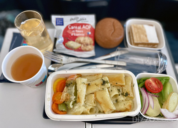 이륙 1시간 후 기내식이 제공되었다. 파리발 에어프랑스 프리미엄 클래스 승객들은 미쉐린 스타 셰프 프레데릭 시모냉(Frédéric Simonin)이 개발한 기내식을 즐길 수 있다. 화이트 파스타와 소고기 메뉴 중 화이트 파스타를 선택했는데, 크리미한 소스와 알단테로 삶아진 면이 조화를 이뤄 마치 파리의 고급 레스토랑에서 식사하는 기분이었다.