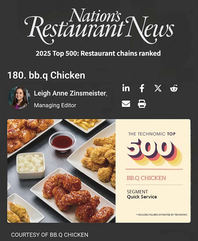 BBQ 관계자는 “네이션스 레스토랑 뉴스 Top 200 진입은 세계 외식 산업의 중심인 미국에서 BBQ의 비즈니스 모델과 브랜드 철학, 맛이 통하고 있다는 점에서 매우 의미 있는 성과”라며, “앞으로도 글로벌 시장에서의 경쟁력을 바탕으로 K-푸드를 대표하는 글로벌 외식 브랜드로 성장하겠다”고 말했다.