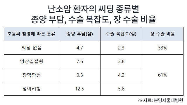연구팀은 국내 3개 병원에서 진행성 난소암으로 수술받은 환자 85명을 대상으로 수술 전 초음파 검사에서 관찰되는 ‘씨딩’ 유형을 ▲없음 ▲작은 결절이 망처럼 퍼진 형태 ▲얇게 넓게 퍼진 형태 ▲덩어리 형태 등 네 단계로 분류해 실제 수술 난이도와 어떤 연관이 있는지를 분석했다.