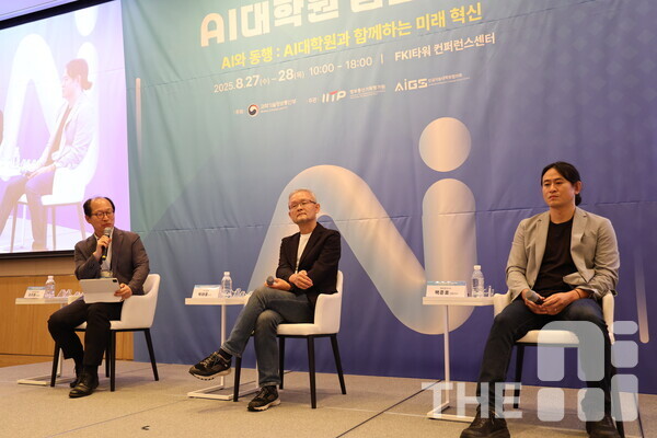27일 여의도 FKI타워 컨퍼런스홀에서 열린 ‘2025 AI대학원 심포지엄’ 토크콘서트에서 박태웅 녹서포럼 의장과 백준호 퓨리오사AI 대표는 국내 AI 경쟁력에 대해 “충분히 가능하다”고 강조했다. 토론은 이지형 AI대학원협의회장 겸 성균관대 AI대학원장이 좌장을 맡아 진행했다.