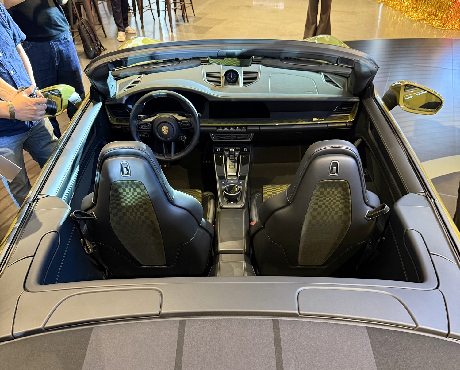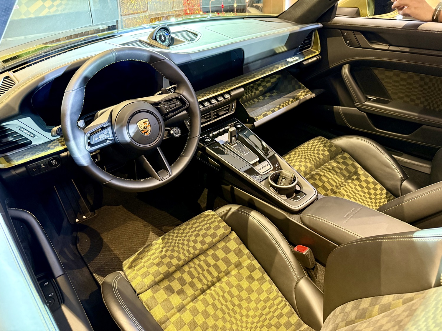 인테리어 하이라이트는 블랙 컬러와 올리브 네오 컬러가 조화를 이루는 아이코닉한 파샤 패브릭 패턴이다. 원단의 그래픽 디자인과 다양한 크기의 직사각형이 정교하게 배열된 패턴은 마치 휘날리는 체커기를 연상시킨다. 또한, 최초의 911에 적용된 1963년도의 크레스트와 동일한 디자인의 포르쉐 크레스트가 부착된다. 프런트 펜더에는 골드 컬러의 포르쉐 익스클루시브 매뉴팩처 배지, 트렁크 리드의 그릴에는 포르쉐 헤리티지 배지가 각각 위치한다.