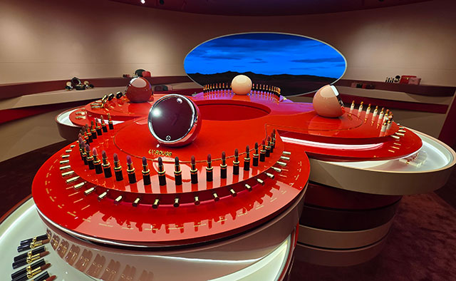 3층 카페 공간에서는 립스틱 컬러에서 영감을 얻은 디저트와 음료가 제공되며, 브랜드 경험을 다층적으로 전달했다. 디저트 접시 위에는 루이 비통 로고가 새겨진 마카롱과 케이크가 놓였으며, 신제품 립스틱 컬러명을 활용한 음료도 선보였다.