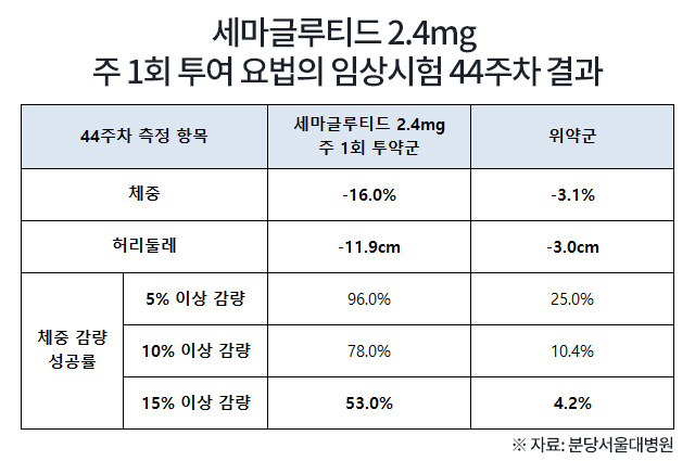 연구팀은 한국과 태국의 12개 의료기관에서 BMI 25 이상 비당뇨 비만 성인 150명을 모집해, 세마글루티드 2.4mg을 주 1회 주사 투여한 뒤 44주간 위약군과 비교했다. 이전까지 진행된 임상시험은 서양인 기준인 체질량지수(BMI) 27 또는 30 이상에 맞춰져 국내 및 아시아 진료 현장에 바로 적용하기에 한계가 있었다.