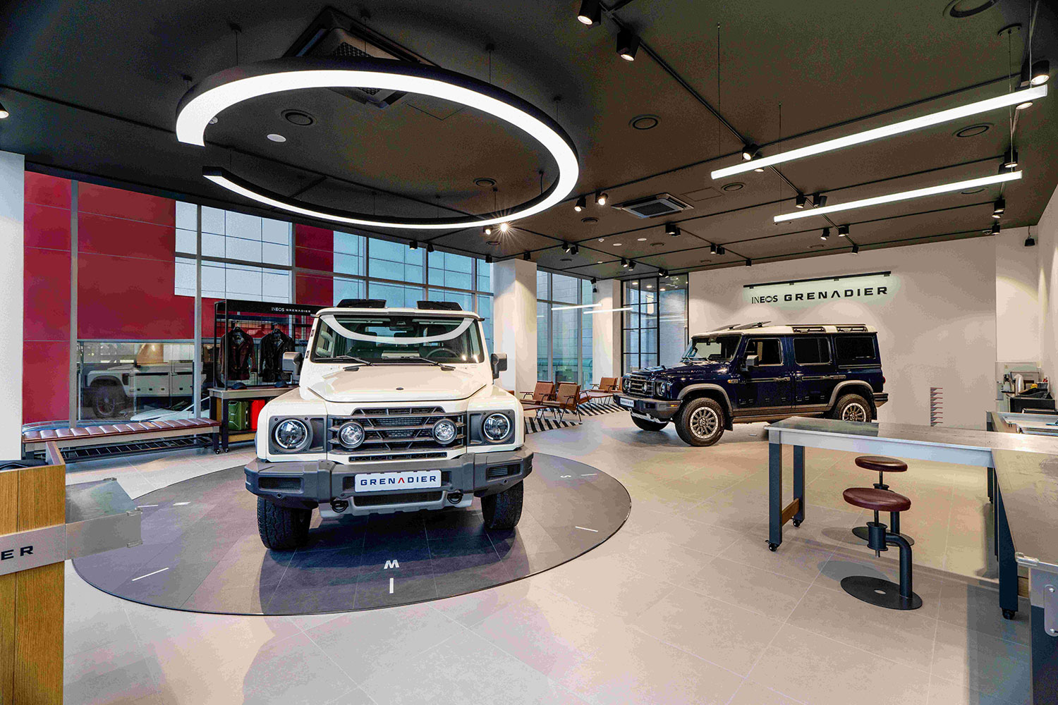 내부는 클럽하우스, 스튜디오, 아뜰리에를 연상시키는 공간으로 구성돼 기능적이면서도 간결·정직한 브랜드 성격을 보여준다. 나무·금속·블랙 스틸·새들 레더 등 천연 소재가 곳곳에 적용돼 그레나디어의 강인한 내구성과 편안한 대화 분위기를 동시에 제공한다. 노출형 블랙 천장과 뉴트럴 톤의 레진 바닥은 소재 본연의 진정성을 느끼게 하고, 디스플레이 차량 상단의 '헤드라이트 헤일로' 조명은 그레나디어 헤드라이트 디자인을 강조하며 방문객의 시선을 사로잡는다. 또한, 야전 군용 클립보드에서 영감을 받은 스펙 보드, 고객 접수용 다용도 테이블과 커맨드 벤치, 부분 가죽 마감된 기어·의류 유닛, 드라이브 투어 안내지도, 디지털 디스플레이 등이 배치돼 고객이 원하는 옵션과 오프로드 루트를 직관적으로 체험할 수 있다.