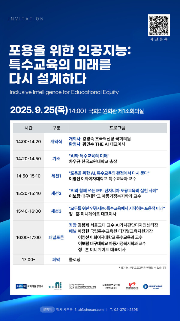 25일 오후 2시 국회의원회관 제1소회의실에서는 ‘포용을 위한 인공지능: 특수교육의 미래를 다시 설계하다’라는 주제의 정책 토론회가 개최된다. 강경숙 조국혁신당 국회의원과 THE AI, 서울교대 AI가치판단 디자인 연구센터, 국회의원 연구단체 ‘약자의 눈’이 주최하고 미니게이트, 블루바이저시스템즈가 후원한다.