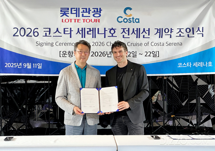 '2026년 5월 전세선 계약 조인식'은 무글리아 프란체스코 코스타 크루즈 부사장과 백현 롯데관광개발 대표이사 사장이 직접 '코스타 세레나(Costa Serena)호'에 승선해 진행됐다.