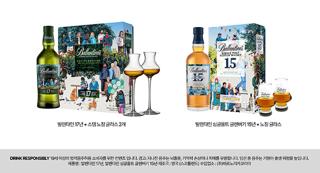 스탠다드 블렌디드 위스키 시바스 리갈은 12년, 15년, 18년 세트를 마련했다. 특히 18년 제품은 리뉴얼된 패키지와 마스터 블렌더의 서명을 담아 소장 가치를 높였다. 아이리시 위스키 제임슨은 하이볼 전용 글라스와 미니어처 글라스를 포함해 합리적인 구성을 선보였다.