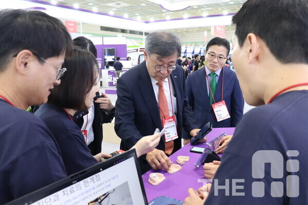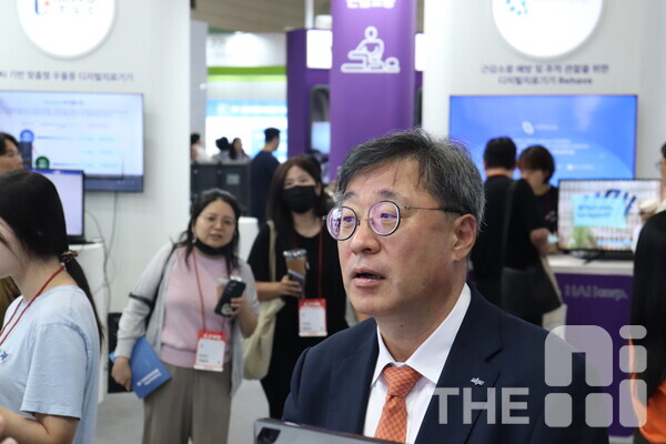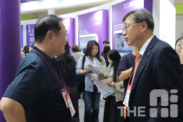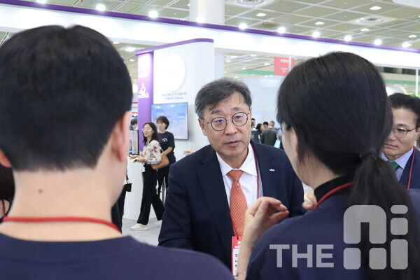 박윤규 정보통신산업진흥원(NIPA) 원장이 18일 오후 서울 강남구 코엑스에서 열린 ‘KHF 2025(국제병원 및 헬스테크 박람회)’ NIPA 디지털헬스 특별관을 방문했다.