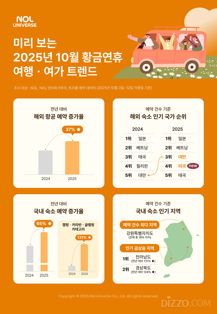 놀유니버스 관계자는 "올해 황금연휴는 일본과 베트남 같은 전통적 인기 지역의 강세 속에 대만, 미국 등 신흥 여행지가 부상하고, 국내에서는 자연 체류형 숙소가 주목받는 트렌드가 뚜렷하게 나타났다"며 "긴 연휴를 배경으로 여행지는 세분화되고 숙박 형태는 다채로워지면서 소비자 선택 기준이 한층 다양해진 점이 이번 트렌드의 핵심"이라고 분석했다.