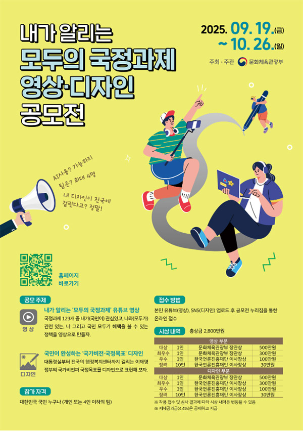 문화체육관광부는 이재명 정부 국정과제 확정(9월 16일)에 맞춰 국민 참여를 확대하고 국가비전과 국정목표 디자인을 함께 완성하기 위해 9월 19일부터 10월 26일까지 ‘내가 알리는 모두의 국정과제, 영상‧디자인 공모전’을 개최한다.