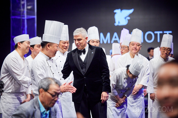 이날 만찬은 JW 메리어트 호텔 서울 우희석 총괄셰프의 지휘 아래 각 레스토랑 헤드 셰프들의 협업으로 특별하게 구성됐다. 일식당 '타마유라' 이경진 헤드 셰프의 꽃게살과 캐비아 주레 에피타이저로 시작해, 한식 명장 양순애 셰프의 공주 옥광밤을 활용한 '밤 타락죽', 중식 왕귀호 셰프의 과거 호텔 대표 중식당 '만호'의 현대적 재해석 요리까지 이어졌다.