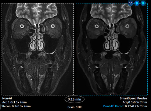 스마트스피드 프리사이즈는 필립스의 기존 MR 검사 시간 단축 기술 ‘컴프레스드 센스(Compressed SENSE)’에 듀얼 AI 엔진을 적용한 것이 특징이다. 데이터 밸런싱 알고리즘과 AI 재구성 알고리즘을 원시 데이터 단계부터 적용해 핵심 신호만 선별하고 불필요한 노이즈를 제거한다.