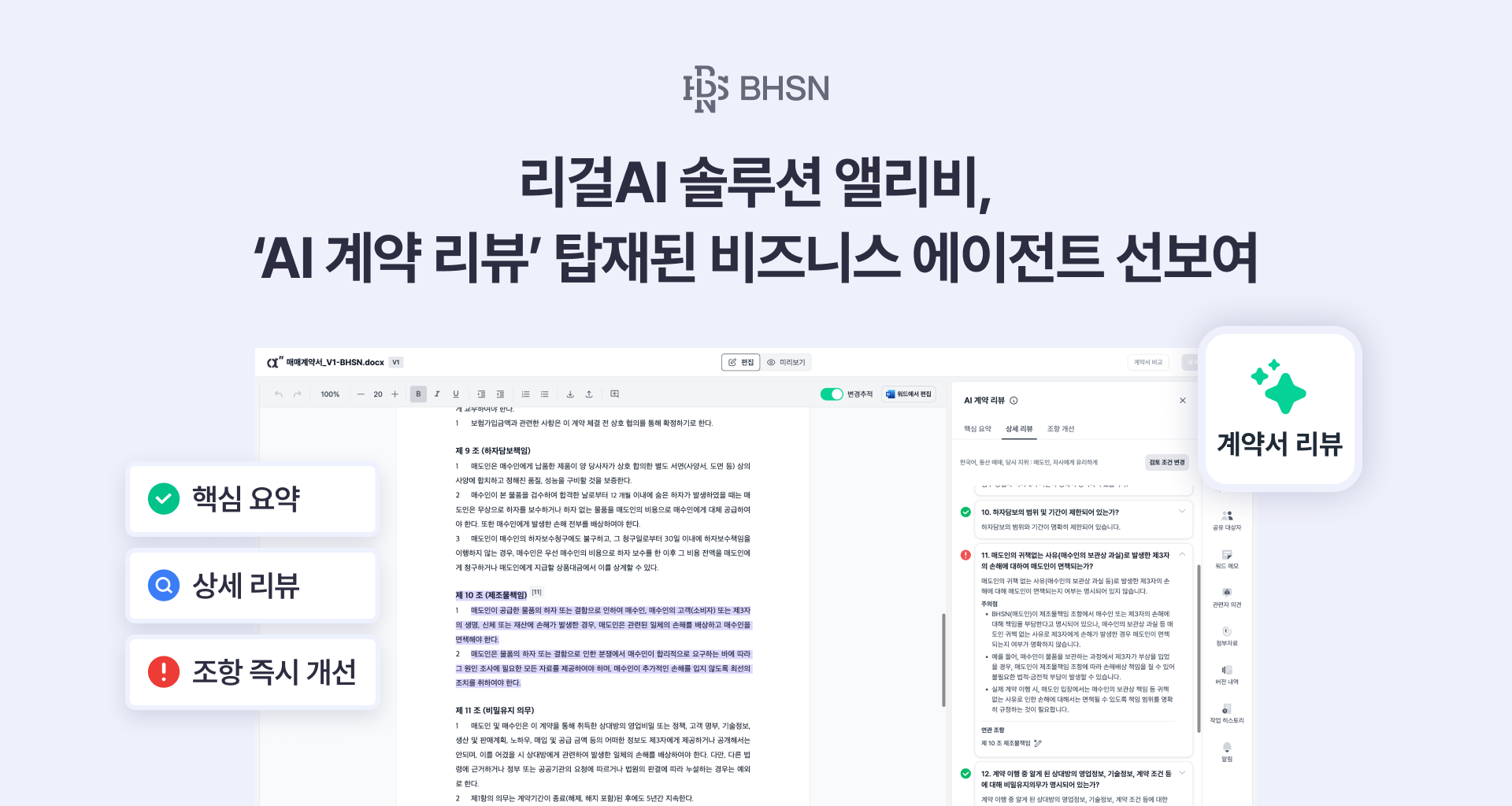비즈니스 에이전트는 법령, 300만 건 이상의 판례, 정부 정책자료 등 방대한 데이터와 법률 특화 리즈닝 기술을 기반으로 관련 법률·판례의 자동 검색 및 요약 서비스를 제공해왔다. BHSN은 기존 계약관리솔루션의 일부 기능인 ‘AI 계약 리뷰’를 단독으로 이용하려는 고객 수요를 반영해 비즈니스 에이전트에 도입하고 B2B 기능을 확대하게 됐다고 설명했다.