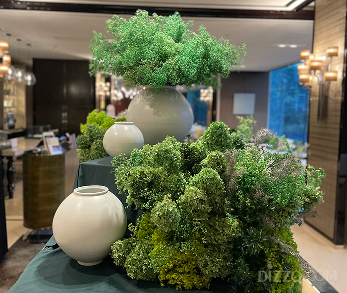 더 라운지에 들어서는 순간, 일상 공간이 갤러리로 탈바꿈한 모습에 감탄이 절로 나온다. 딥그린, 실버, 화이트 컬러 팔레트로 통일된 플로럴 데커레이션이 공간 전체를 감싸며, 여섯 명의 작가들이 선보이는 작품들이 각각의 개성을 뽐낸다.