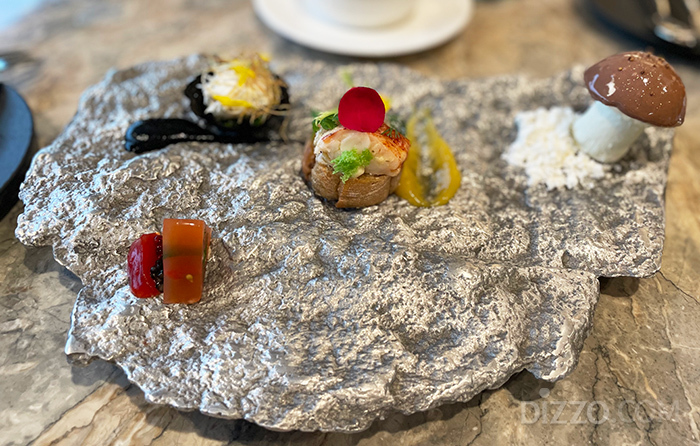 셰프가 작품의 텍스처와 색감을 반영해 구성한 메뉴는 그 자체로 하나의 예술 작품이다. 세이보리 3종부터 시작되는 코스는 시각적 완성도와 맛의 조화가 인상적이다.
