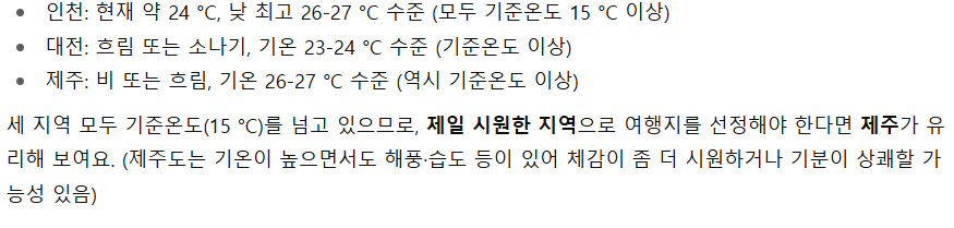 실제로 김 교수가 챗GPT-5에 ‘기준 온도가 T도 일 때, 인천, 대전, 제주 날씨를 확인한 뒤 여행 계획을 세워줘. 세 지역 모두 기준 온도 이상이면 제일 시원한 곳으로 여행 갈거야’라고 입력했더니 챗GPT는 맞지 않는 곳을 제시하기도 했다.