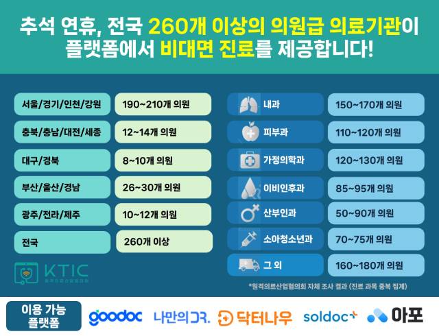 올해 추석이 최장 열흘간 이어지면서 병의원 휴무로 의료 공백이 우려되는 가운데, 원격의료산업협의회(원산협)는 연휴 기간 전국 260여 개 의원급 의료기관이 비대면 진료를 제공한다고 2일 밝혔다.
