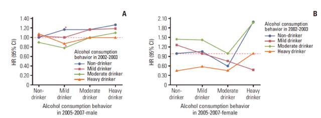 연구팀은 하루 알코올 섭취량을 ▲경도(남성 15g·여성 7.5g 미만) ▲중등도(남성 15~29.9g·여성 7.5~14.9g) ▲고용량(남성 30g·여성 15g 이상)으로 구분하고, 음주량 변화에 따른 위암 발생 위험을 비교했다.