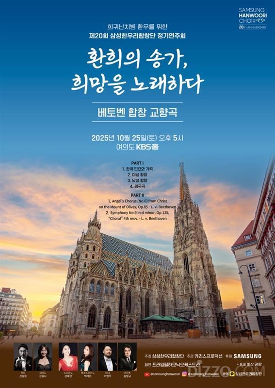 삼성한우리합창단은 10월 25일 오후 5시 여의도 KBS홀에서 제20회 정기연주회를 개최한다고 15일 밝혔다. 이번 공연은 '음악을 통한 치유와 희망'이라는 메시지를 전하며, 베토벤의 합창교향곡(Symphony No.9)을 비롯한 다채로운 레퍼토리를 선보인다.