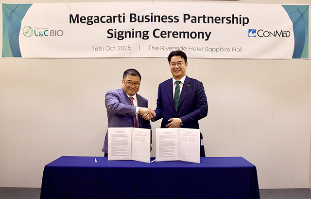인체조직 재생의학 전문기업 엘앤씨바이오(대표이사 이환철·이재호)가 자사의 퇴행성관절염 치료용 의료기기 ‘메가카티(MegaCarti)’의 해외 시장 진출을 본격화한다. 회사는 미국 의료기기 기업 콘메드 아시아(CONMED ASIA)와 손잡고, 동남아시아 주요 7개국을 포함한 아시아 8개국을 대상으로 독점판매 계약을 체결했다고 17일 밝혔다.