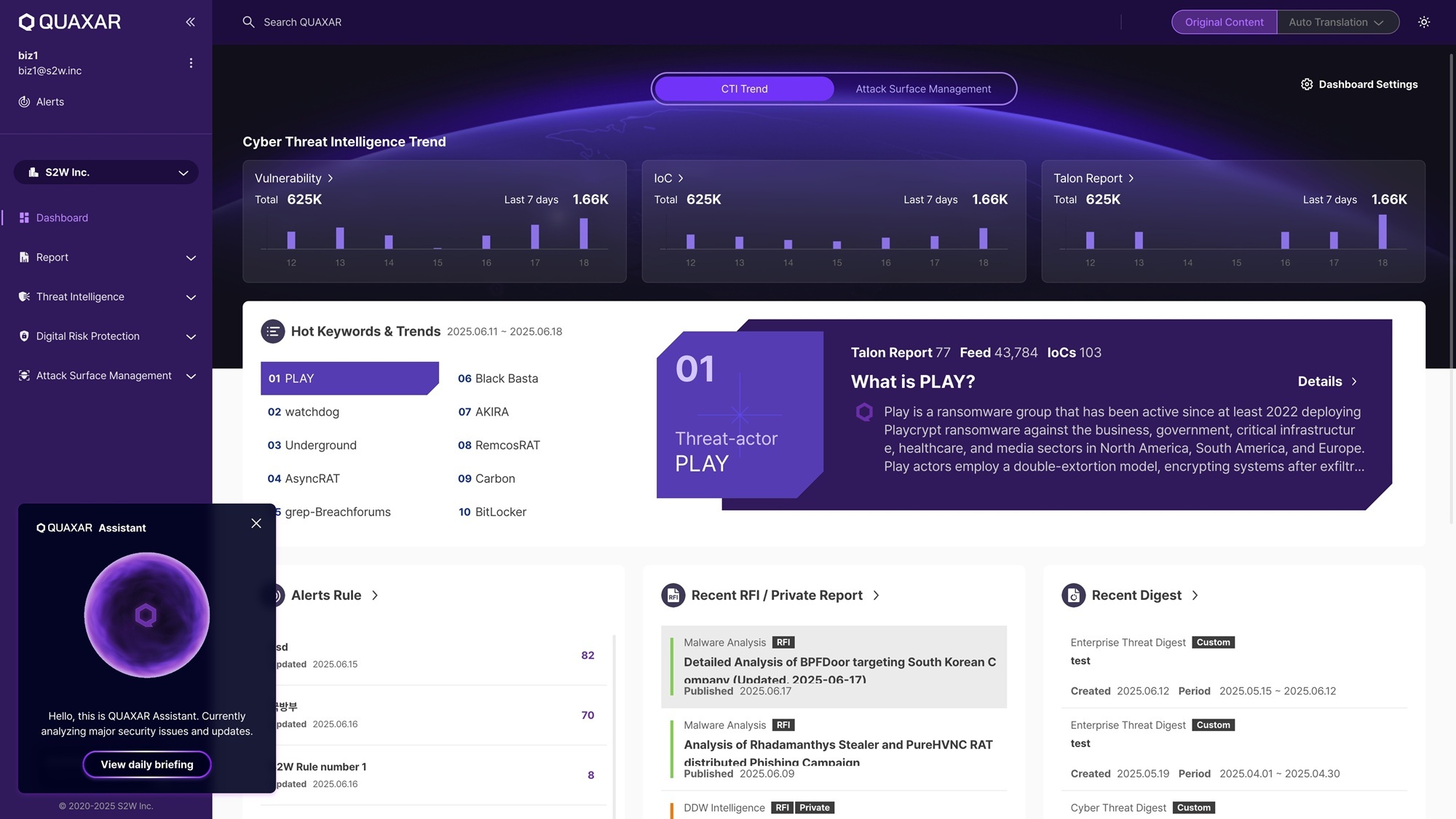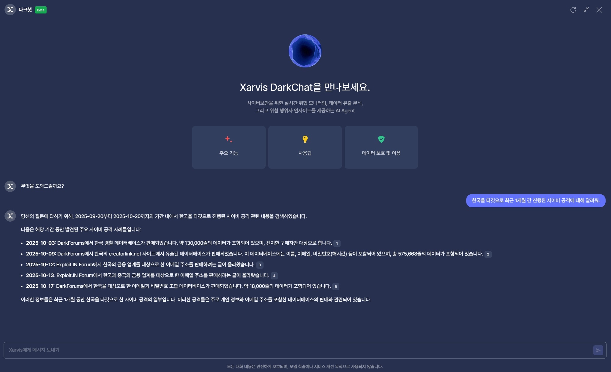 S2W는 이번 전시를 통해 공공·정부기관용 안보 AI 플랫폼 ‘자비스(XARVIS)’와 기업 및 기관용 보안 AI 플랫폼 ‘퀘이사(QUAXAR)’를 선보인다. 자비스는 범죄 관련 데이터를 신속하고 일목요연하게 확인할 수 있는 AI 챗봇 ‘다크챗(DarkCHAT)’ 및 국가·산업군·위험도 등을 기준으로 유출 데이터를 자동 분석해 중요 사건을 선별하는 ‘데이터 브리치(Data Breach)’ 등을 탑재한 사이버범죄 인텔리전스 솔루션이다. 또한 비트코인 주소와 텔레그램 아이디, 이메일 주소 등의 분산된 개별 정보를 연결해 숨겨진 관계를 식별하고 범죄 자금의 유통 흐름을 추적하는 ‘지식그래프 기반 교차분석’, 다크웹·텔레그램 사용자 프로파일링 도구 ‘유저 프로파일링(User Profiling)’ 등도 내장함으로써 수사의 효율성을 강화하는 데 기여한다. 현재 국내 주요 수사·방위기관 및 싱가포르·인도네시아·사우디아라비아 등의 해외 정부기관에 제공되며 글로벌 안보 AI 시장의 높은 주목을 받고 있다.