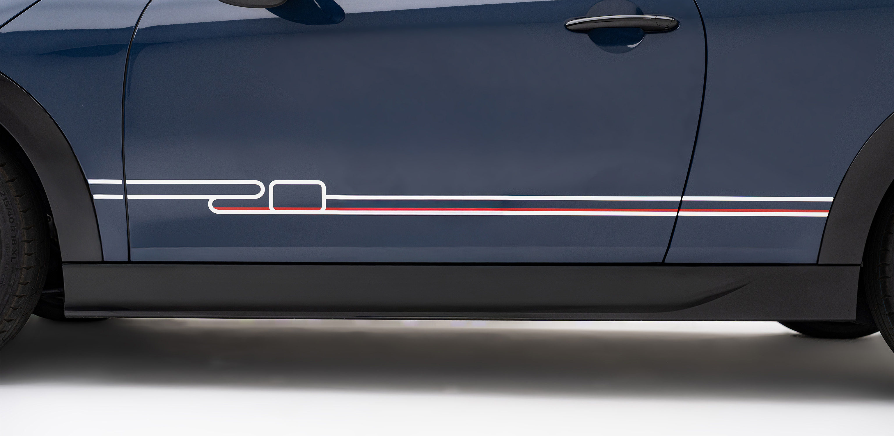 차체 측면 하단과 도어스커프에는 긴 스트라이프와 숫자 '20'을 조합한 디자인을 사용했다. MINI 코리아의 영광스러운 헤리티지와 미래를 향한 여정을 상징하는 요소로 의미를 더했다. C필러 상단과 타이어 밸브 캡에는 MINI 코리아 20주년 기념 '미니이십' 엠블럼을 적용했으며, 플로팅 허브 캡에도 MINI 코리아 20주년 기념 'MINI' 엠블럼을 넣었다.