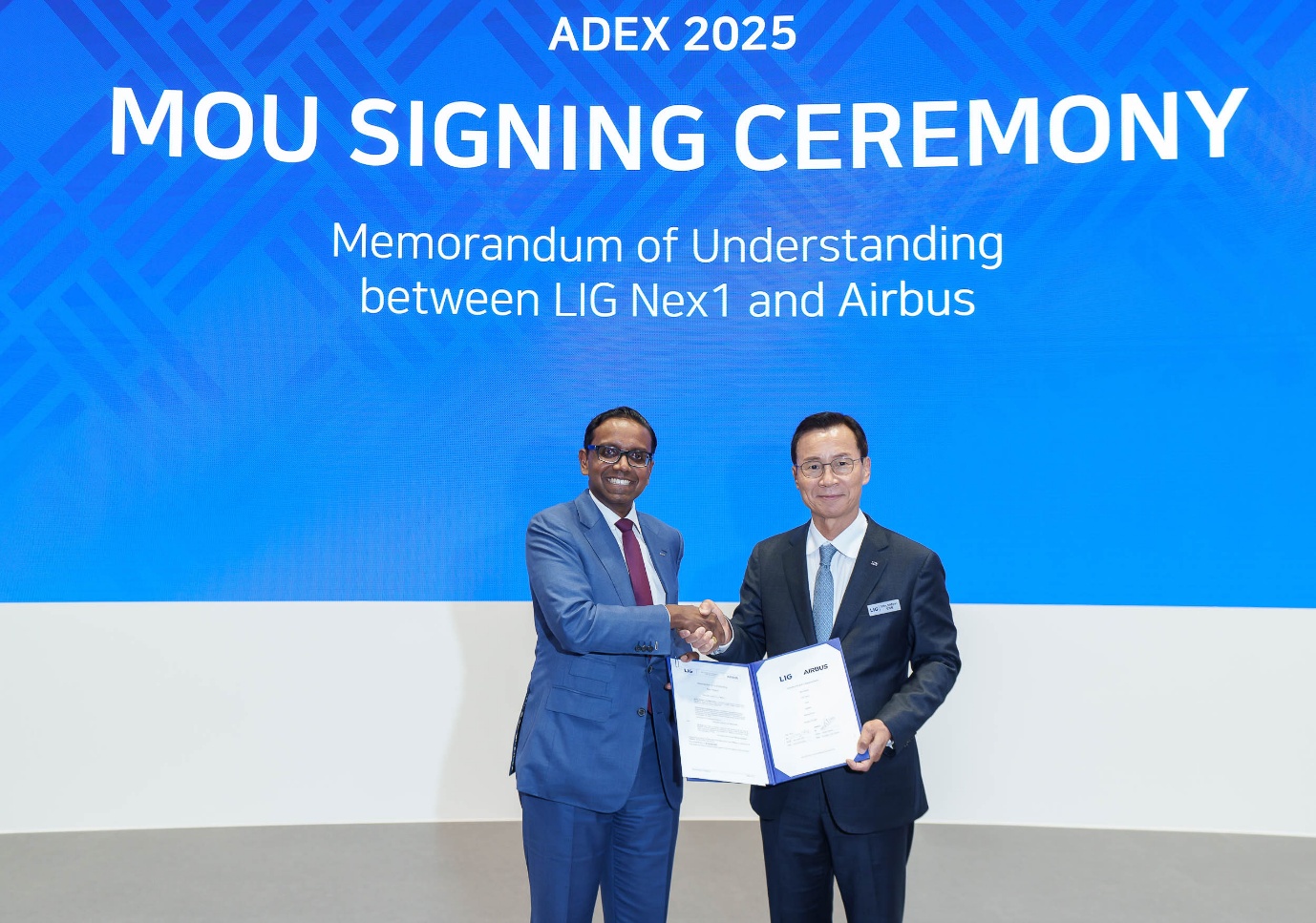지난 20일 경기 고양시 킨텍스 '서울 국제 항공우주 및 방위산업 전시회(ADEX) 2025'에서 진행된 체결식에는 아난드 스탠리 에어버스 아시아태평양지역 총괄 대표, 신익현 LIG넥스원 CEO가 참석했다. 양사는 그동안의 견고한 협력 관계를 바탕으로 통합 방공 시스템, 최첨단 디지털 방위 솔루션 등으로 협력 범위를 확대하기로 했다.