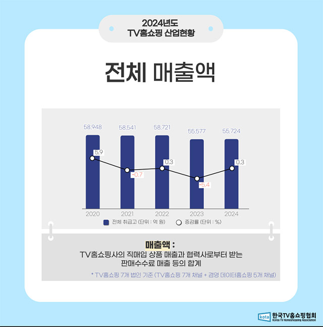 한국TV홈쇼핑협회에 따르면 국내 TV홈쇼핑 전체 매출은 2020년 5조8000억 원에서 2024년 5조5724억 원으로 감소했다. 방송 매출 비중도 같은 기간 52.5%에서 47.4%로 낮아졌다. 스마트폰 보급과 모바일 중심 소비 환경 확산, 라이브커머스의 성장세가 맞물리면서 산업 전반이 복합적인 위기를 맞고 있다. 라이브커머스 시장은 2023년 약 3조 원 규모에서 5년 뒤 24조 원 규모로 성장할 것으로 전망된다.