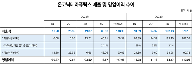온코닉테라퓨틱스는 30일 공시를 통해 2025년 3분기 매출 192억 원, 영업이익 83억 원을 기록했다고 밝혔다. 분기 기준 사상 최대 실적이다.