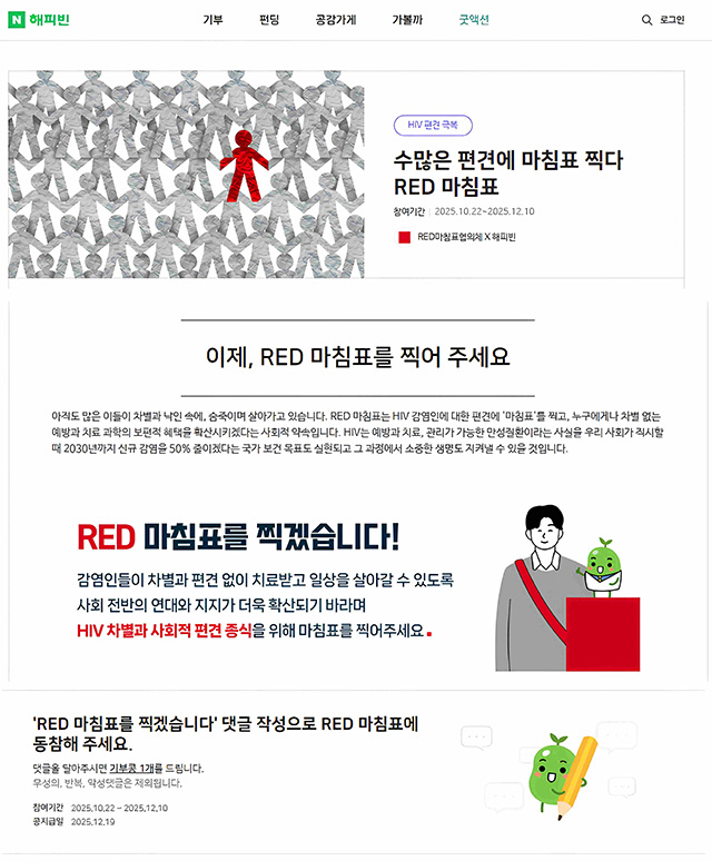 이번 ‘레드 마침표 굿액션 캠페인’은 해피빈 페이지 내 댓글로 ‘HIV 차별과 편견을 종식하자’는 연대의 메시지를 남기면 참여가 완료되고, 해피빈의 기부콩이 지급되는 방식으로 진행된다. 협의체는 감염인과 취약계층에 대한 사회적 지지와 인식을 넓히기 위한 시민 참여형 공익 캠페인으로 이 활동을 기획했다.