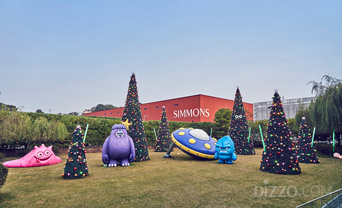 주차타워에서 테라스로 향하는 길에는 레드 컬러의 대형 크리스마스 트리가 방문객을 맞이한다. 잔디 정원에는 최대 높이 8미터의 메인 트리를 포함해 크고 작은 트리 6개가 설치됐으며, 중심부의 UFO 조형물과 몬스터 캐릭터 조형물들이 초현실적 분위기를 연출한다.