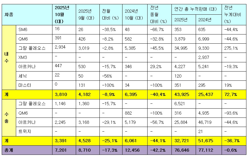 르노코리아가 지난달 내수 3810대, 수출 3391대로 총 7201대를 판매했다고 3일 밝혔다. 이는 전년 동기 대비 42.2% 감소한 수치다.