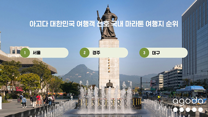 경주는 유적지와 아름다운 자연경관을 함께 즐길 수 있는 경주국제마라톤을 통해 마라톤 여행지로 인기를 얻고 있다. 대구는 2026년 대구마라톤 참가 신청자가 이미 4만 명을 돌파하며 큰 관심을 모았을 뿐만 아니라, 아고다 내 검색량도 전년 대비 190% 증가하는 등 국내 마라톤 여행지 중 가장 높은 성장률을 기록했다.