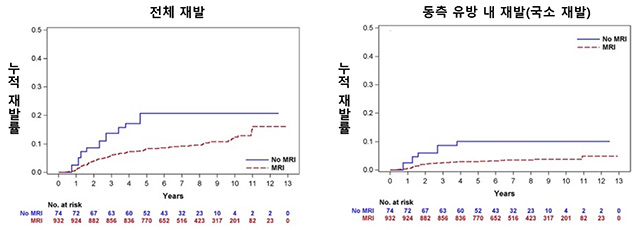 분석 결과, 전체 재발률과 생존율에는 유의한 차이가 없었지만, 동측 유방 내 재발률은 MRI군 1.6%, 비MRI군 3.3%로 절반 수준이었다.