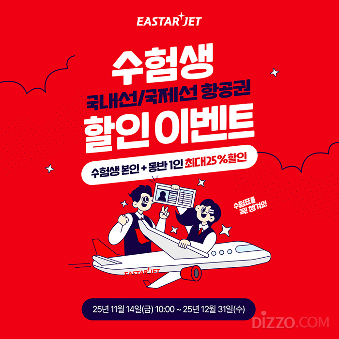 이스타항공은 11월 14일부터 12월 31일까지 수험생 본인과 동반 1인에게 국내선 일반 운임 대비 25%, 국제선 할인 운임 대비 최대 10% 추가 할인 혜택을 제공한다. 탑승 기간은 11월 14일부터 내년 3월 28일까지다.