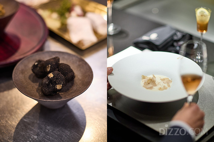 이번 갈라 코스에서는 화이트와 블랙 트러플을 중심으로, 계절이 선사하는 식재료들을 세심하게 엮었다. 예를 들어, 알바산 화이트 트러플을 곁들인 순무 포타주에서는 순백의 순무가 가진 담백함에 깊은 향의 트러플을 더해 부드럽고 풍성한 계절감을 담았고, 블랙 트러플과 구운 순무, 소꼬리 콘소메에서는 깊이 있는 풍미와 진한 색감으로 ‘블랙’의 매력을 표현했다. 또한, 흰살생선인 백옥돔과 송이버섯, 가을 트러플을 곁들인 채끝 롤 스테이크, 블랙 트러플과 오리 소바 등 각 요리마다 콘셉트의 두 축인 블랙과 화이트가 교차하며 등장한다. 디저트에서는 화이트 트러플 향을 입힌 군고구마와 바닐라 아이스크림으로 마무리해, 따뜻하면서도 향긋한 여운을 남기고자 했다.