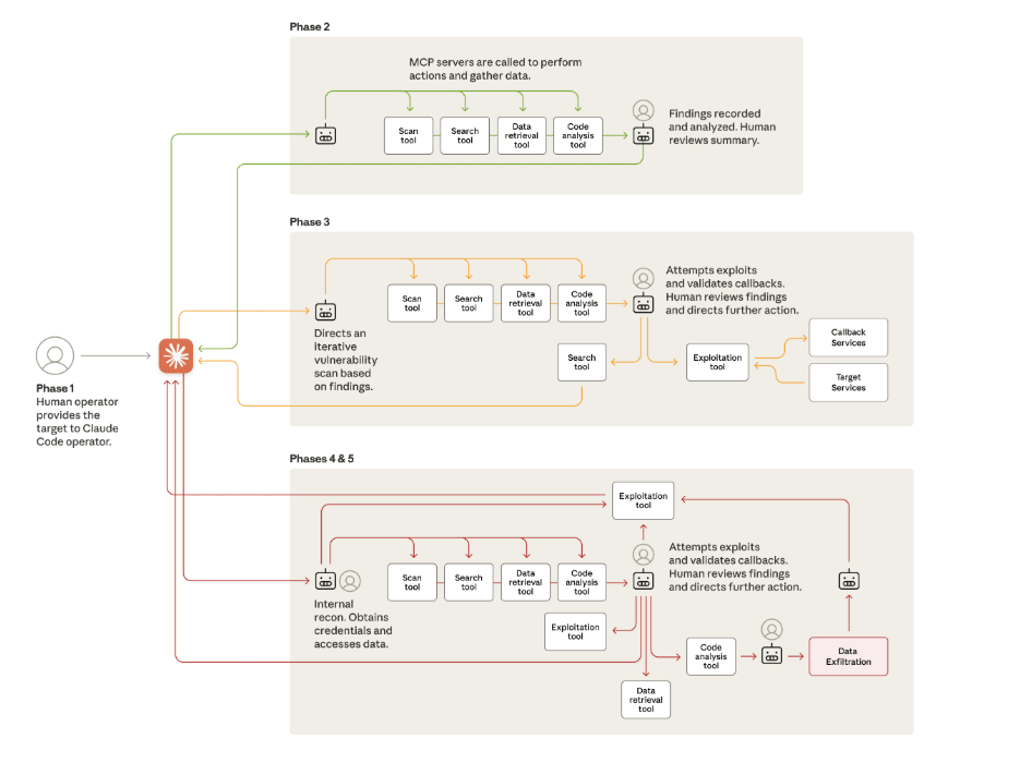 앤트로픽은 13일(현지시각) 지난 9월 중국 국가 지원 해킹 그룹으로 추정되는 공격자들이 자사 AI 도구를 악용해 글로벌 기업과 정부기관 약 30곳을 표적으로 스파이 활동을 벌인 사실을 확인했다고 밝혔다. 전체 공격의 80~90%를 AI가 자율적으로 수행했으며, 인간은 캠페인당 4~6차례만 개입한 것으로 나타났다. 이는 AI가 단순히 해커를 ‘보조’하는 수준을 넘어 공격을 ‘주도’한 첫 사례다.