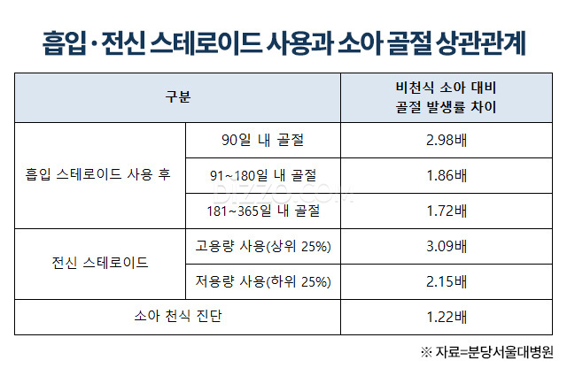 흡입 스테로이드 사용 후 90일 이내 골절 발생률은 비천식 소아 대비 약 3배 높았다(2.98배). 91~180일(1.86배), 181~365일(1.72배)에서도 위험이 유의하게 증가했다. 전신 스테로이드의 경우 사용량이 많을수록 위험이 커져, 고용량군은 3.09배, 저용량군은 2.15배 높았다. 천식 진단 자체도 골절 위험을 22% 증가시키는 것으로 나타났다.