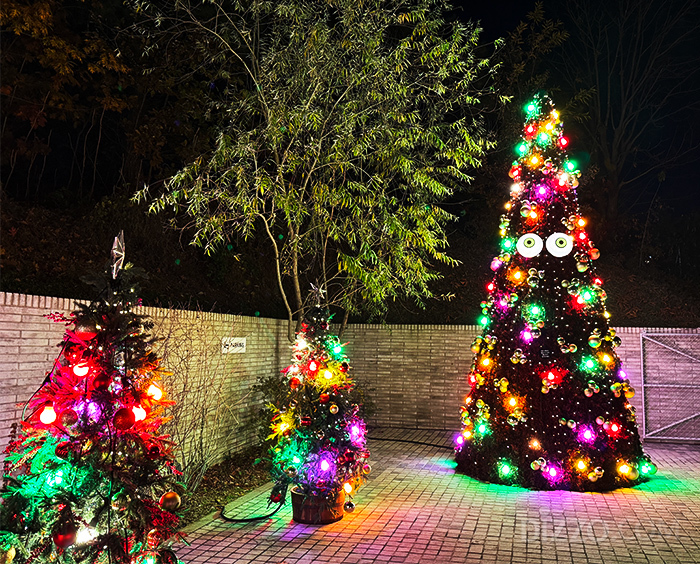 각 트리에는 조명형 눈알 장식이 달려 있어 몬스터 콘셉트를 살리며 초현실적인 분위기를 연출한다. 눈알 장식은 기괴하면서도 귀여운 매력을 풍기며 일반적인 크리스마스 트리와 차별화된 재미를 선사한다. 화려한 컬러 전구와 오너먼트가 어우러진 트리는 어둠 속에서 환상적인 빛의 향연을 만들어냈다.