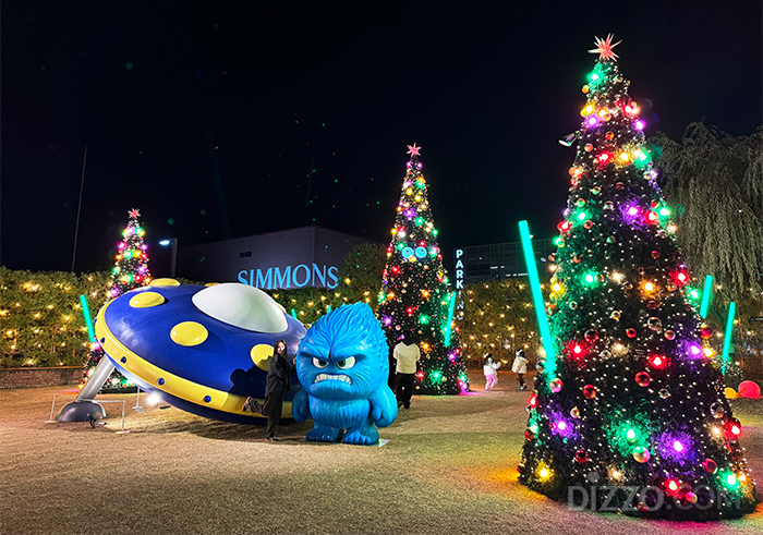 테라스 입구를 지나 잔디정원에 들어서자, 형형색색 조명이 어우러진 장관이 펼쳐졌다. 최대 8미터 높이의 메인 트리를 포함해 크고 작은 트리 6개가 세워져 있고, 중심부에는 UFO 조형물이 불시착한 듯 설치돼 있다. 건물 외벽에 새겨진 거대한 ‘SIMMONS’ 로고와 트리들이 함께 반짝이는 모습은 시몬스 테라스의 시그니처 풍경이다. -