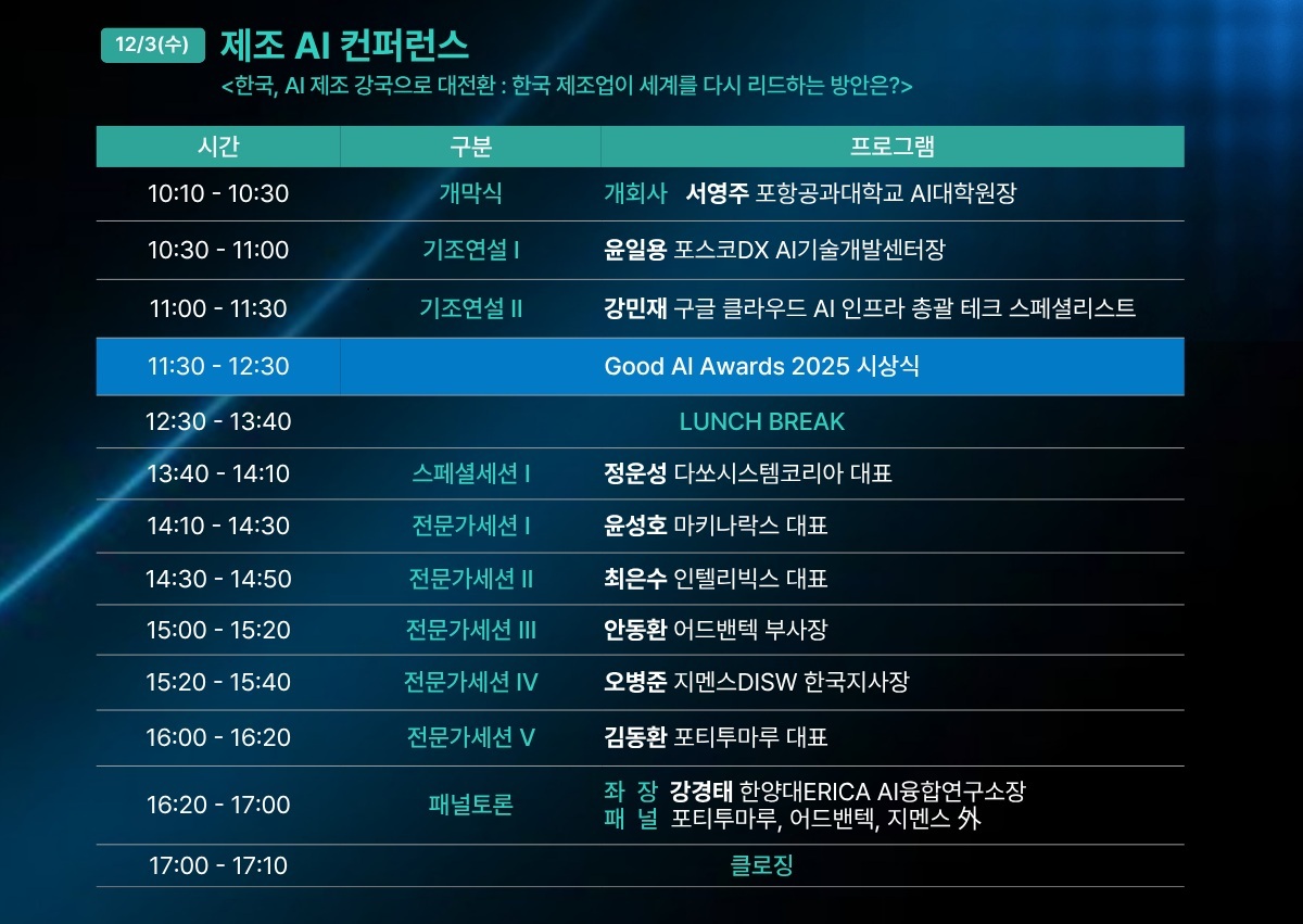 포항공대 인공지능연구원과 인공지능 전문매체 더에이아이(THE AI)는 다음달 3일, ‘한국, AI 제조 강국으로 대전환: 한국 제조업이 세계를 다시 리드하는 방안은?’을 주제로 제조 AI 컨퍼런스를 진행한다. 이번 행사는 현재 제조업 분야에 활용되는 AI 혁신 기술을 공유하고 미래 전망과 비전을 제시한다.