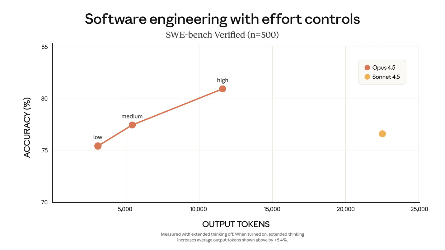 중간 수준의 에포트 설정만으로도 오푸스 4.5는 소프트웨어 엔지니어링 벤치마크에서 소네트 4.5와 동일한 최고 성능을 기록하면서, 출력 토큰은 76% 감소했다. 최고 에포트 수준에서는 소네트 4.5 대비 성능이 4.3%포인트 향상되면서 토큰 사용량은 48% 줄었다.