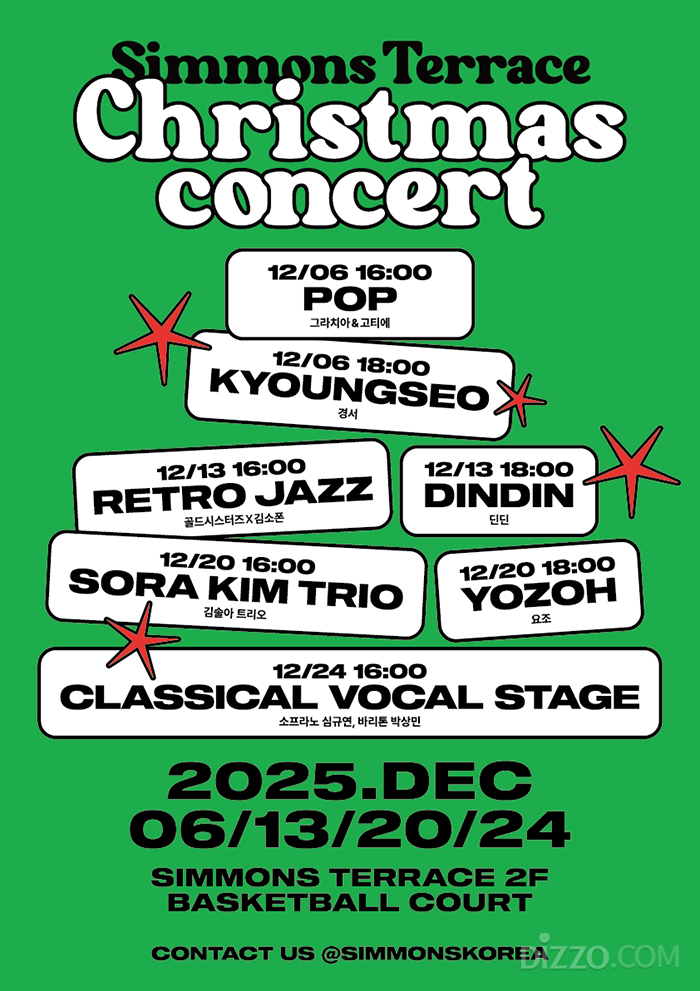 시몬스는 이천 소재 '시몬스 테라스'에서 크리스마스 콘서트를 개최한다고 27일 밝혔다. 콘서트는 12월 6일, 13일, 20일, 24일 총 4일간 시몬스 테라스 2층 바스킷볼 코트에서 열린다.