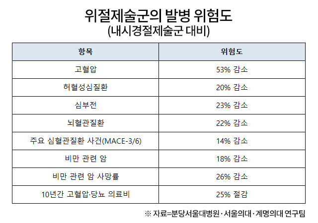 연구팀은 국민건강보험 빅데이터(2002~2020년)를 기반으로 조기 위암 환자 7만 4천여 명을 최대 15년간 추적 관찰했다. 이 중 4만 9,578명은 위절제술을, 2만 4,789명은 내시경절제술을 받았다. 비교 결과, 위절제술군은 내시경절제술군 대비 고혈압 발생 위험이 약 53% 낮았고, 허혈성심질환·심부전·뇌혈관질환도 각각 20%가량 더 낮게 나타났다. 주요 심혈관 사건(MACE-3/6) 발생률 또한 약 14% 감소했다.