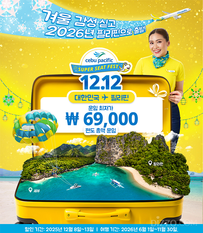 세부퍼시픽은 12월 8일부터 13일까지 한국 출발 마닐라 및 세부행 항공권을 편도 총액 69,000원부터 판매한다고 밝혔다. 이번 프로모션 항공권의 여행 가능 기간은 2026년 6월 1일부터 11월 30일까지로, 내년 성수기 휴가를 미리 준비하려는 여행객들에게 유리한 조건이다.