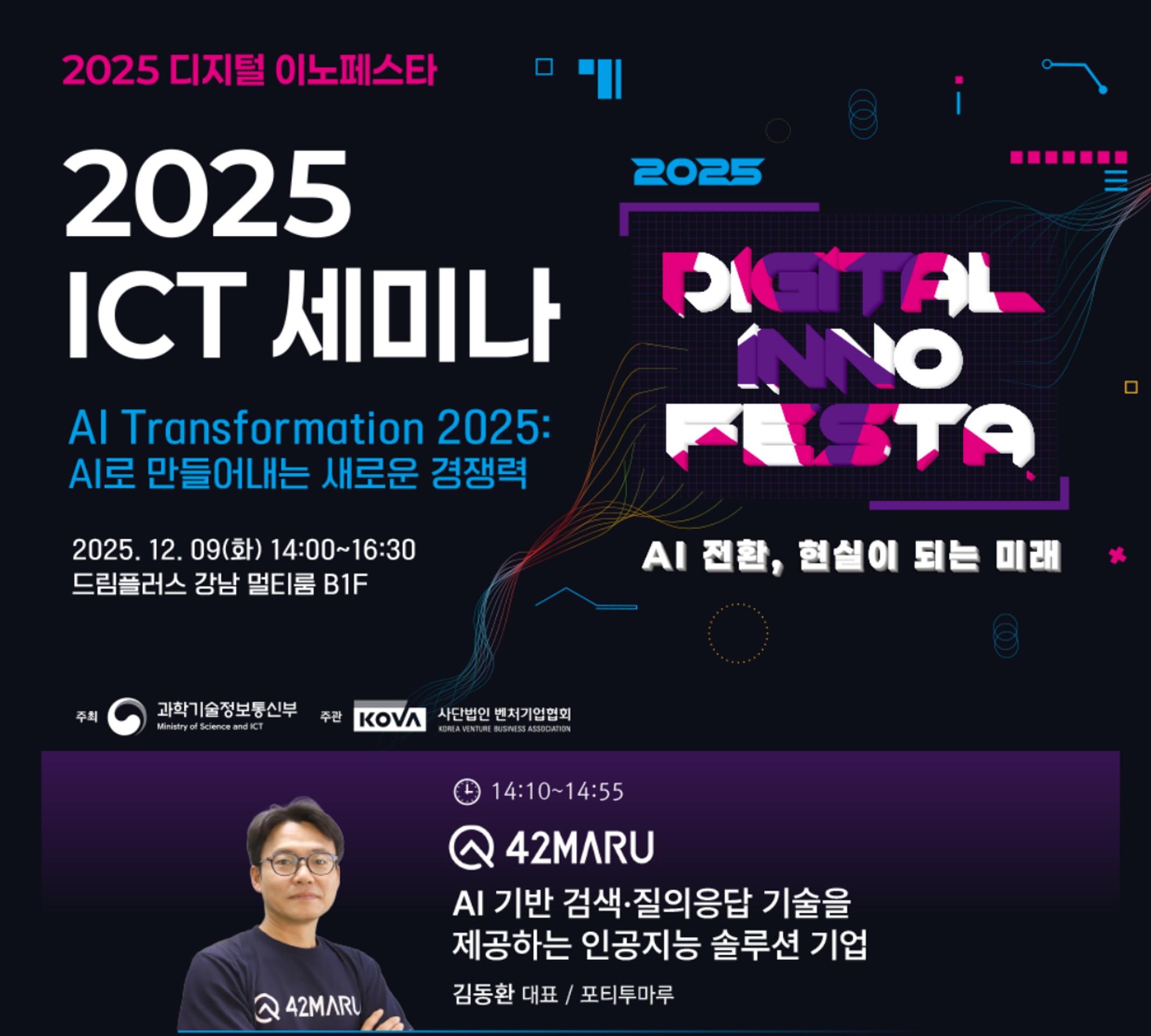 포티투마루는 서울 드림플러스 강남에서 열리는 ‘2025 디지털 이노페스타(2025 Digital Inno Festa)’에 참가해 내년 AI 및 AX 트렌드를 공유하고 ICT 비즈니스 혁신 전략을 제시한다고 9일 밝혔다.