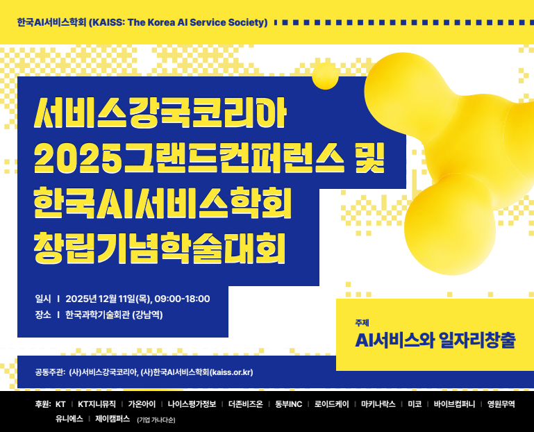 이번 행사는 ‘AI 서비스와 일자리 창출’을 주제로, 사단법인 한국AI서비스학회(KAISS)와 서비스강국코리아가 공동 주최한다. 한국AI서비스학회는 AI 기술이 연구 단계를 넘어 산업과 사회 전반을 혁신하는 ‘AI 서비스’ 시대로 진입함에 따라, 이를 선도하고 대한민국 경제사회를 혁신하기 위해 창립되었다.