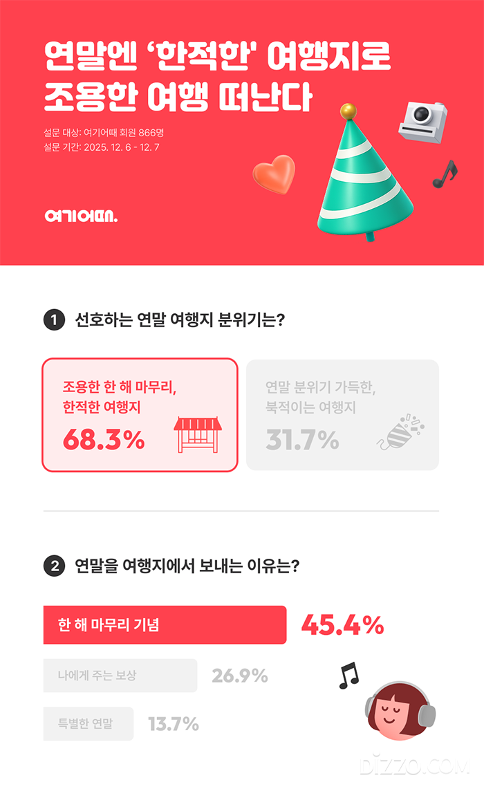 여기어때가 앱 이용자 866명을 대상으로 설문조사한 결과, 연말 여행지로 ‘한적하고 조용한 분위기의 여행지’를 선호한다는 결과가 나왔다. 응답자의 68.3%가 선택해, ‘연말 분위기 가득한 북적이는 여행지(31.7%)’에 비해 크게 앞선 수치다.
