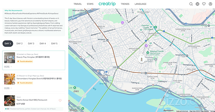 크리에이트립은 여행 계획부터 실행, 기록까지 전 단계에 걸쳐 AI 기반 서비스를 운영하며 외국인 여행객에게 맞춤형 한국 여행 경험을 제공한다. 가장 주목할 만한 서비스는 현재 실사용자를 대상으로 운영 중인 '여행일정 AI 에이전트'다. 이 에이전트는 대화를 통해 사용자의 취향과 상황을 파악하여 여행 일정 검색, 추천, 편집, 그리고 동선 최적화까지 지원한다. '명동에서 홍대까지 이동할 때 중간에 들를 만한 곳 있을까?'와 같은 질문에도 AI가 동선을 고려한 최적의 장소를 추천해, 여행 초보자도 손쉽게 완벽한 일정을 완성할 수 있다는 평가를 받고 있다.